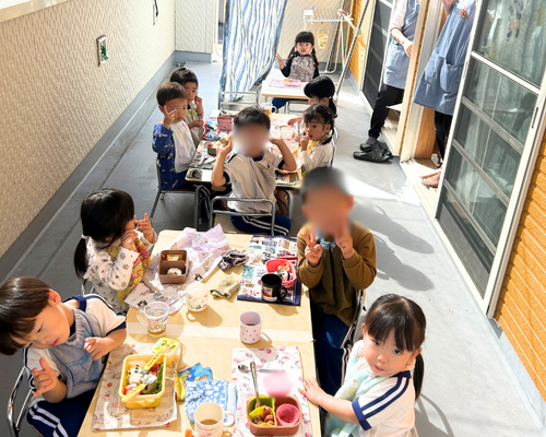 園庭やテラスにシートを広げ、外の風を感じながら食べるお弁当は特別だったようで、どの子もよく食べていました☺