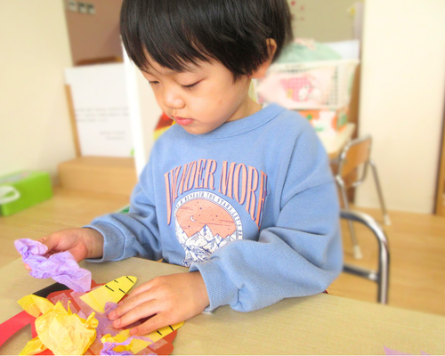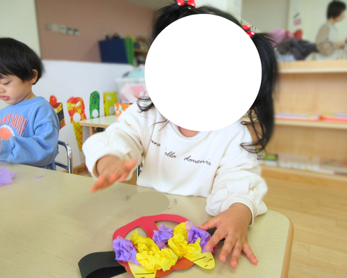 節分のお歌を歌ったり、おにの塗り絵をしたりしながら、少しずつ節分に向けて気持ちを高めてきた子どもたち。花紙をくしゃくしゃと丸めて作った鬼のお目を身につけ、ワクワクした表情で会がスタートしました。